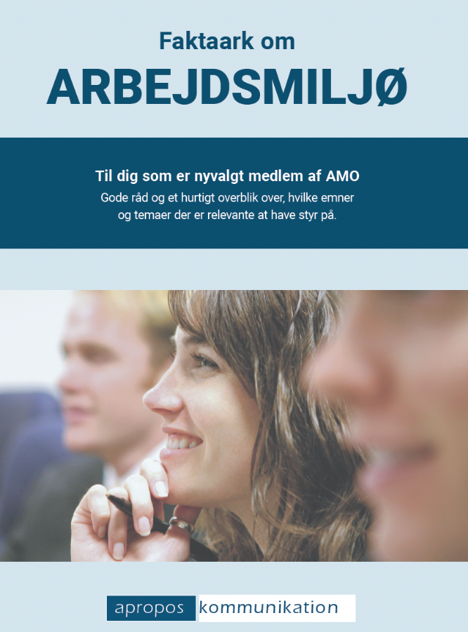 På vores lovpligtige arbejdsmiljøuddannelse modtager du bl.a. vores Faktaark om arbejdsmiljø i fysisk form. Dette faktaark indholder en beskrivelse af nogle af de væsentlige elementer i arbejdsmiljøarbejdet og er et godt opslagsværk til både den erfarne AMR/arbejdsleder og den nye repræsentant i AMO.